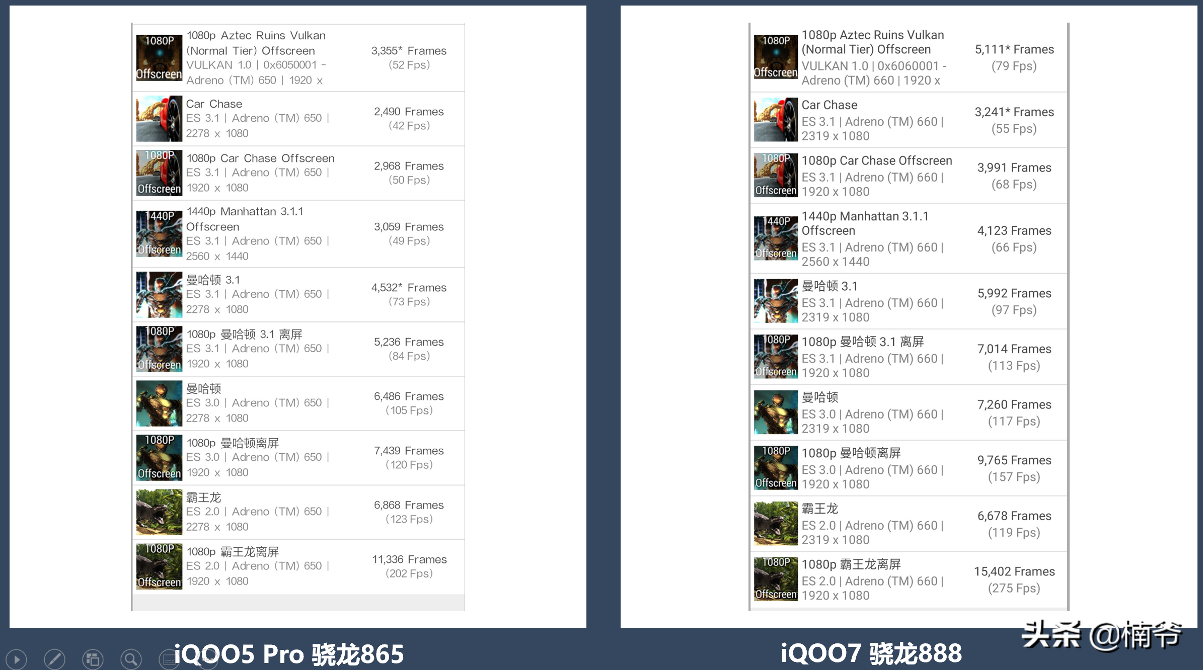 粗暴点说,Adreno660简直就是个超频版本的Adreno650。GFXBench的数据我截取了高性能测试的一部分热门项目。例如,骁龙865的曼哈顿3.1离屏为84fps,而骁龙888的则为113fps,提升率为34%。如果不谈功耗这件让人很不愉快的事的话,这个提升幅度还是比较让人满意的,但如果提到功耗: