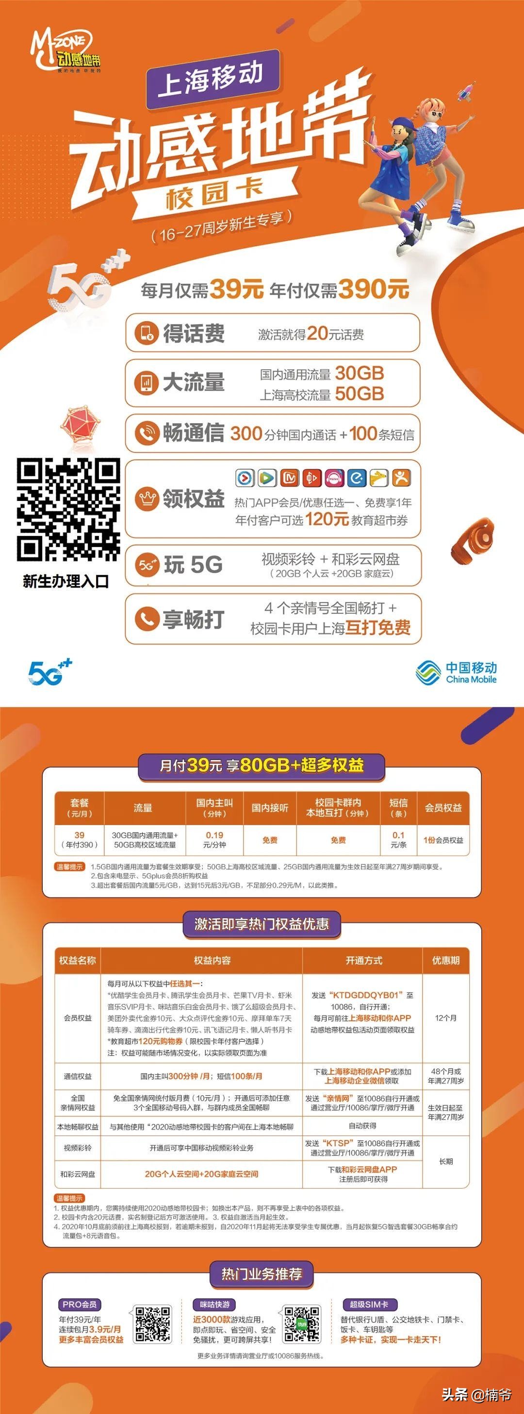 声明:我很少发这种市场文章,主要是单位自己的活动,而且确实套餐非常实惠,适合17-26岁的人群办理,特别适合长期驻在上海的学生党(中学生,大学生,研究生,博士生)和年轻人办理。如果不爱看文字,我就简单说一下,就是39块钱包80GB流量,其中上海本地高校区域流量50GB(大学城附近的爽了),全国流量30GB,非常靠谱的选择。文案是上海移动小伙伴写的,哈哈。